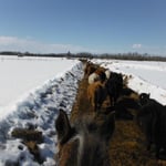The cows live close to the home ranch yard in the spring so they may be observed while calving. During calving time, we check them a few times a day and make sure all the mother cows and the calves are doing alright. In the summer time, after all the calves are born, we take the herd to the summer pasture and they graze there until November or December, depending on the grass, water and snow situation. For the winter the cows live in the paddocks eating hay, the bulls have to stay in the pens and so do the calves.