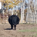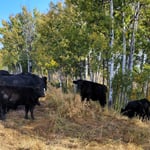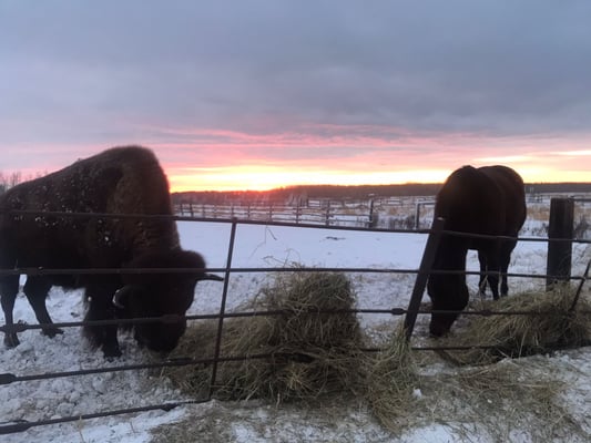 Buffy is a bottle raised bison who lives on the ranch. She is a tame bison, raised by humans and therefore she thinks she is a human as well. Buffy will allow (that's the correct word) you to scratch her and even touch her horns. However she can also do the silliest "dance" that can be fairly intimidating. She lives either with the cows or with one of the horse herds on the ranch. She always watches us when we fix fences in her area. Sometimes she blocks the water trough so the cows cannot drink until she allows them to come up.