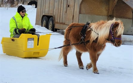 Missy is a very big personality in a very small body! She is a busy character and must be doing something or she’s not happy. Standing still without having something to eat is not likely. Missy would like to be bossy but that is not allowed at Winning Ways, so she must do as she is told. Her small size makes her manageable by most determined children and all adults who realise they must be the leader and not Missy. She can be groomed and led for Ground Work lessons and she looks very good in harness with a cart. I the winter she pulls the sled or the GT to provide fun and entertainment for helpers and even Kelly. Oh yes, Missy can do tricks for treats!