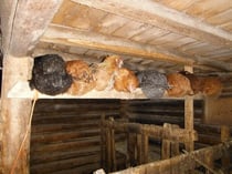 The chickens who live at Winning Ways have their own chicken house (not pictured). Since the chicken house is in one of the sheep pens, volunteers and others going to pick up eggs, frequently had to defend the egg pail in their hand from marauding sheep. Since the arrival of Avian flu to our province, we have been advised to keep all fowl inside so there is no comingling with wild birds that may have the disease. The chicken house is too small to keep many hens, so the chickens are living in the old log barn.