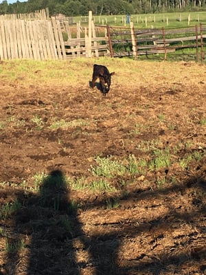 Hera was NOT going away from the herd, toward the chute and tried several evasive measures. Her poor little calf was soon left behind by its fleeing mother. Paul had a long pole, because Hera had shown some aggression when she first started to move away from the herd. Paul used the pole from horseback to push and prod the calf in the correct direction. Kelly on her fleet pony followed the uncooperative beast, until at last, Hera decide to go in the correct direction.