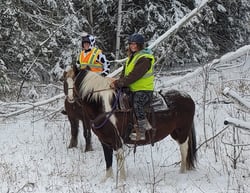 There was a good reason that I had chosen to ride my favourite, old, trail horse, Dale. I knew that it takes a great deal to stop that old boy! Apparently when I did some “off-trail” riding to circumvent downed trees, there were horses who were horrified that they must now push their way through hazel-brush and willows. Then there were the spruce trees whose branches bent way down under the snow. Riding under them, unsettling the snow hanging there, turned me and several other riders into snowwomen on horseback!