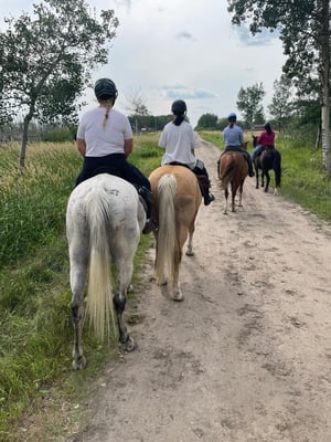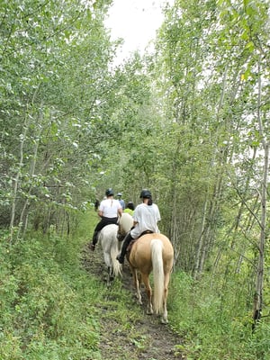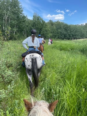 We proceeded to the Lake Trail and headed down the hills, with the silly, fat pony, Jackie was riding, at the very back, where she seemed most comfortable. When we reached the bottom, we turned south to go around Hog Island. Jackie went a bit further ahead in the line of horses and left me and another rider at the back. All of a sudden, the pony bolted and tore off at a crazy pace trying to outrun the hornets it had suddenly encountered. Jackie did some fancy riding and righted herself from the initial shock of the bolt and was sitting back upright, heading past all the other horses. When Ellie (aka “silly fat pony”) caught up to the lead horse, Velvet, she planted her feet and came to an extremely abrupt stop. I was very concerned about Jackie’s safety as I watched her go over the head of the pony!