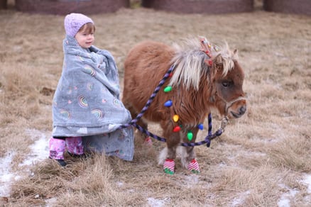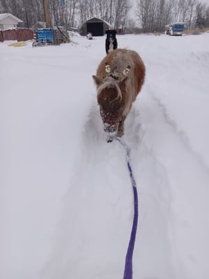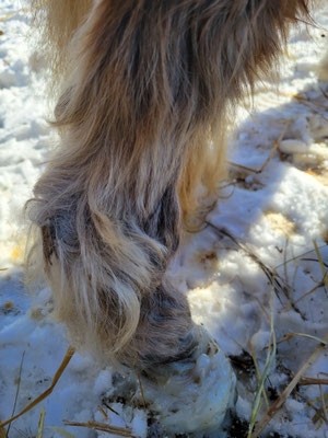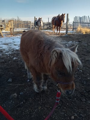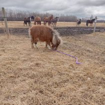 We decided that CC’s undershot jaw was probably another one of her problems that makes chewing and especially tearing off food difficult. We started feeding CC “mash” (soaked alfalfa/timothy cubes) with a little oats, and she started to gain a bit of wight so she looks more like a regular miniature pony now. CC lives in the small pen in front of the Brown’s house and has her own shelter. She receives warm mash morning and evening, perhaps we will have to lower the amount of mash once the cold weather has passed by.