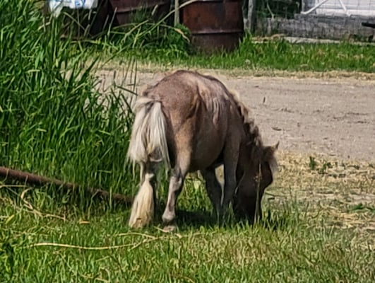 Probably because her body was struggling to heal for most of the spring, CC did not shed properly. She was fuzzy and, I suspect, itchy when the days got hot. CC found a convenient scratching spot as she wandered about the yard. It does give you an idea of just how tiny CC is. A few days later Dawn brought out her clippers and over the course of a couple of days she turned CC into an even smaller pony! I imagine that CC felt much cooler with all the winter hair gone.