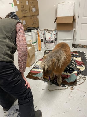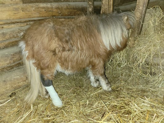 This method did not seem to be bringing any improvement, so we moved to Plan B, stabilizing the fetlock joint by fusing the bones in the ankle. This time we took CC to the vet clinic and, because of the injections, gave her a sedative. Dr. Ed and his assistant clipped the fetlock and then injected alcohol into the bursa to cause the calcification of the bone. A cast was then placed on the leg to immobilize the entire structure until the bone had time to grow, in a straighter position.