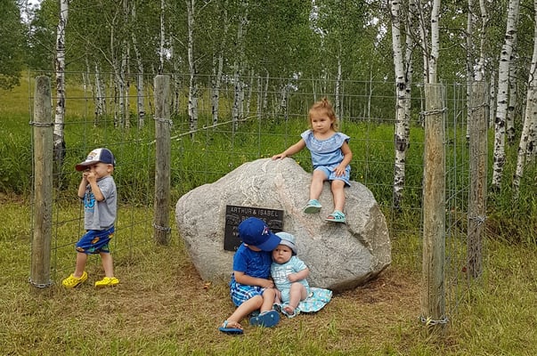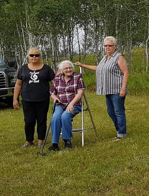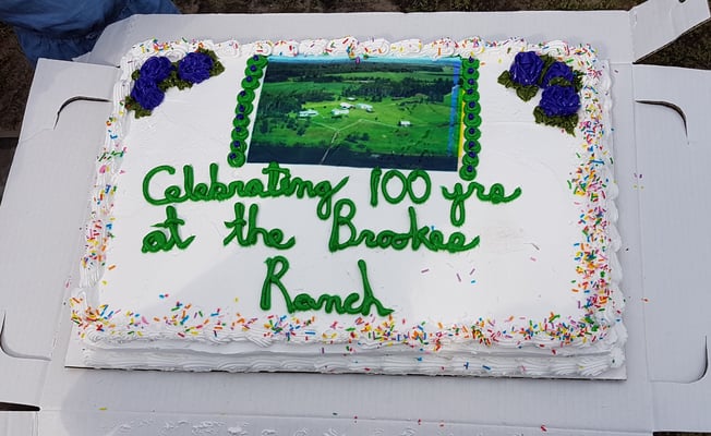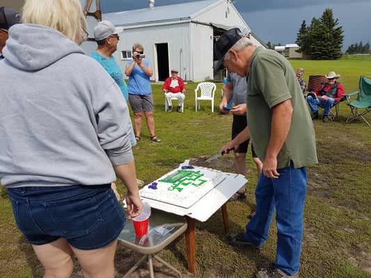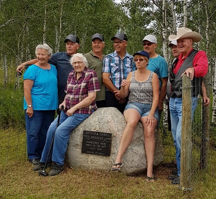 The Brookes Family consists of Granny’s nieces & nephews, since her sister and brother-in-law have passed away. The homestead that Grandpa (or is it Great-great Grandpa?) Brookes proved up on 100 years ago is still in the family. The ranch is now run by Grandsons and Great Grandsons. The family usually holds an annual get-together and in 2018 they celebrated the 100th Anniversary of the Brookes Ranch. We took a tour after the cake cutting and saw the site of the original homestead house, which the river nearly washed away when Great-great Grandpa’s family was living in it! That is why the house today is well up the bank, away from the Beaver River. The large rock the different generations are seated on in the photos, has a plaque on it to commemorate the original cabin’s location which is closer to the river bank.