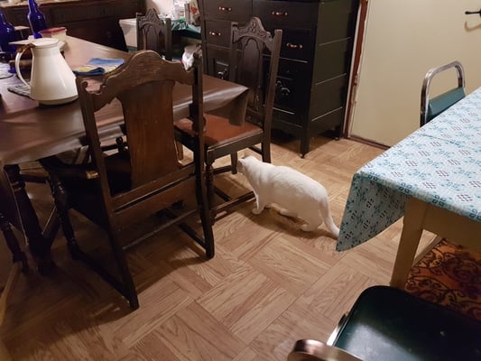 At the PnF Show my little student Nathaniel asked if I would look after his cat while he was in Saskatoon. The cat was a young, neutered male that was used to living in the house and my little student was very attached to his cat. I told him that I could not promise that my Gwen cat would be nice to his cat, but that I would try to be a good cat-sitter for his Fluffy friend. Why the cat was named Fluffy I have no idea! He was neither fluffy, nor cute and cuddly. After a few weeks of being without his cat, Nathaniel’s mother contacted me to say that Nathaniel was missing him so much, she had persuaded the landlord that Fluffy could stay with them in Saskatoon. So, we only had Fluff-McGruff (that sounded much more like a big, strong, muscle cat name!) for about a month. I know Gwen was very glad that he left so she could move back into the house again.