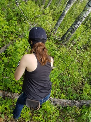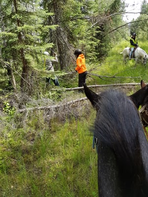 Since some of the experiences offered at Winning Ways include Trail Rides, the crew and I have to maintain the trails. This involves cutting off big trees and clearing out under brush. Many of the trails have down trees laying across them, this is a good deterrent to the quad-bike riders who don’t always have a big chain saw strapped to their machines. Winning Ways horses are not familiar with quads and I would prefer not to encounter these machines on our riding trails. The horses are familiar with stepping over some fairly huge logs!