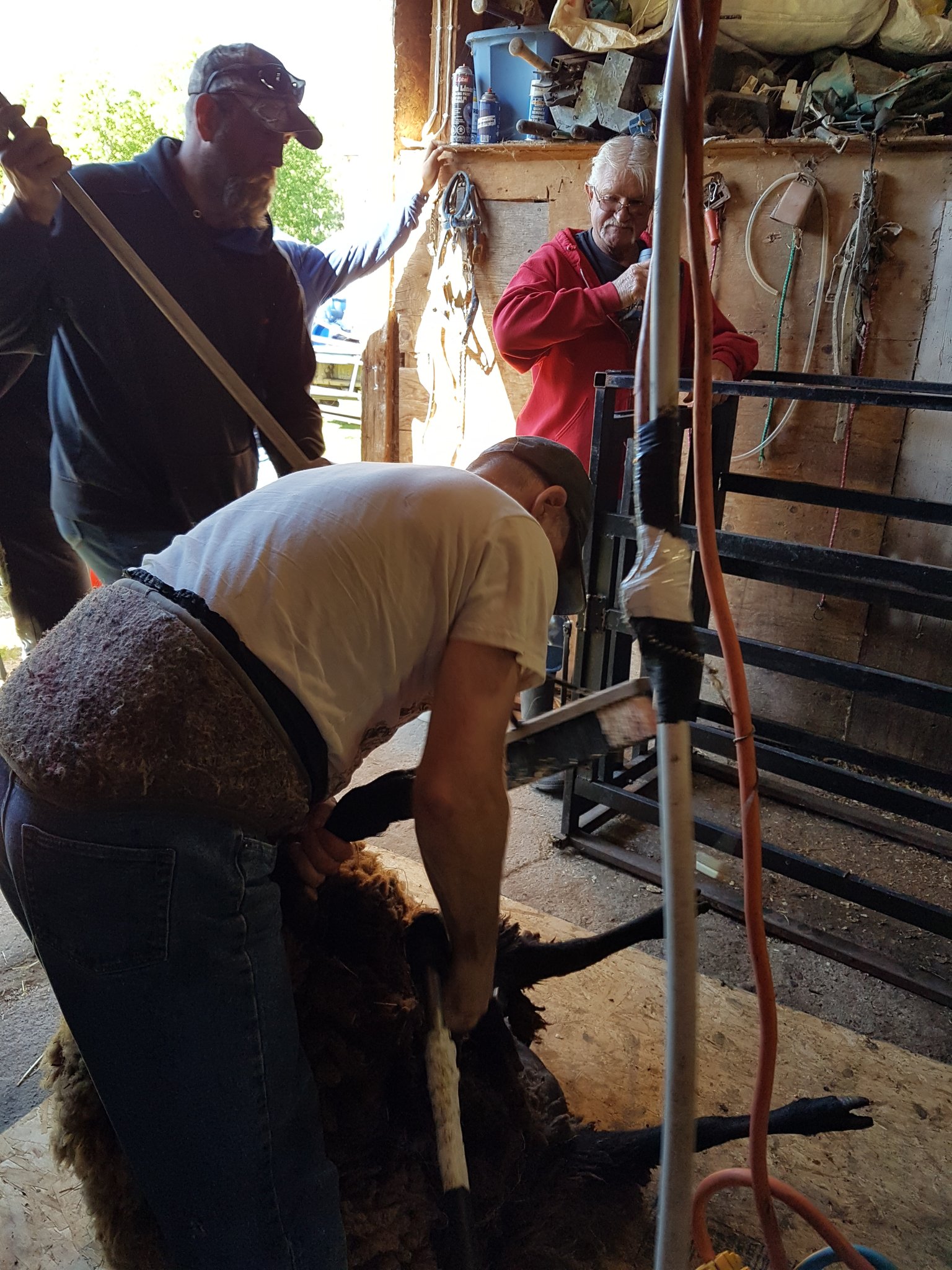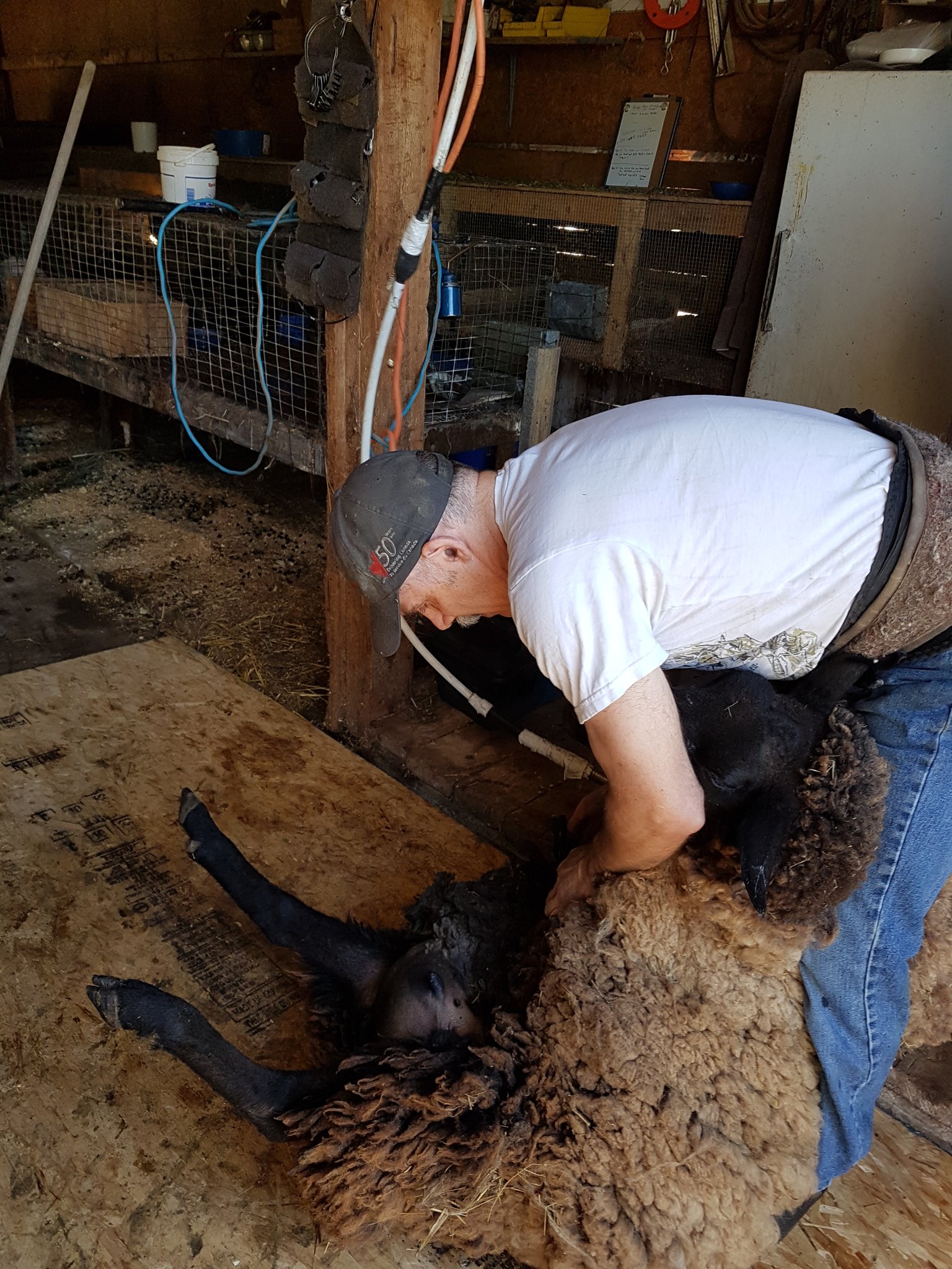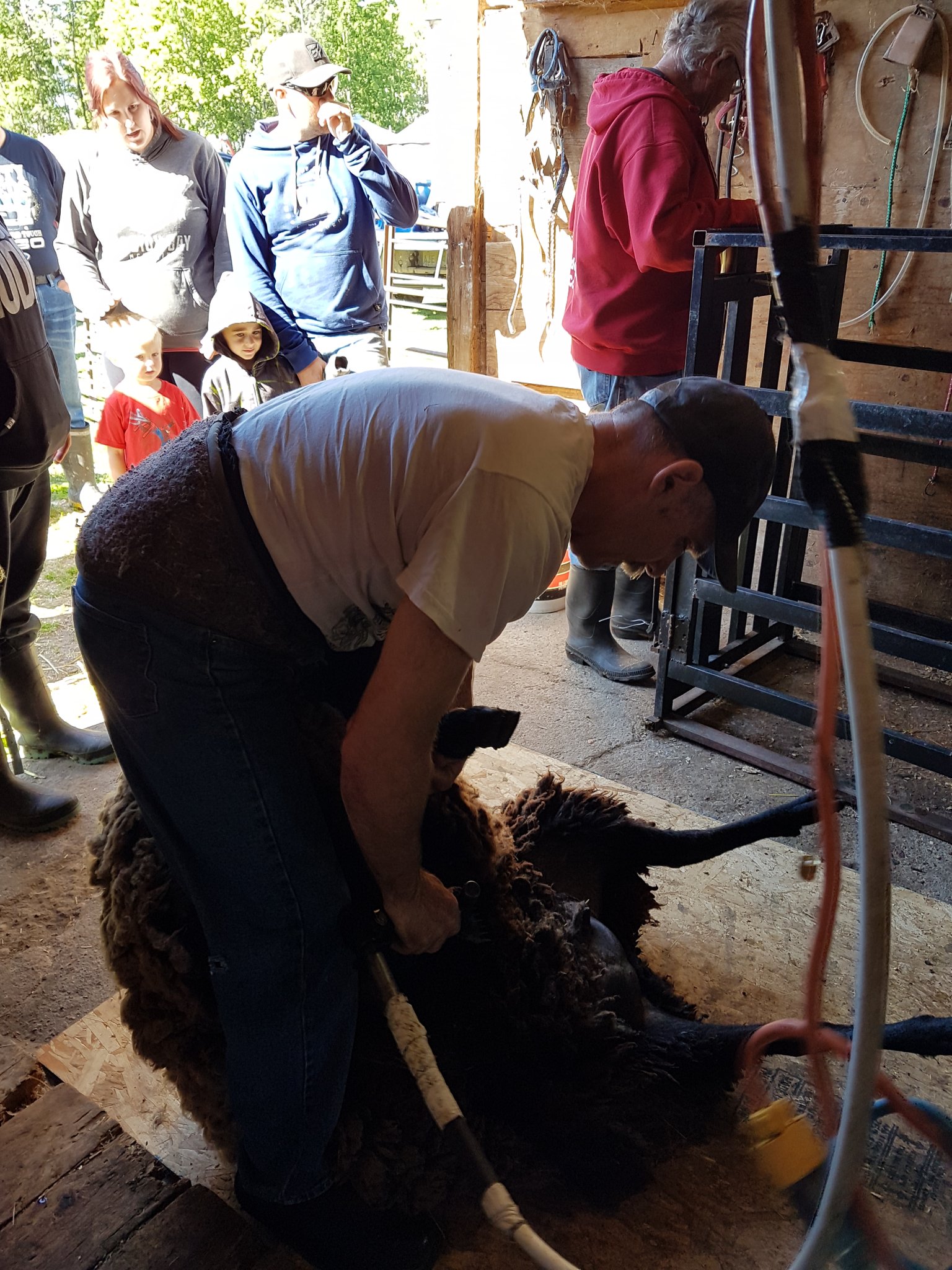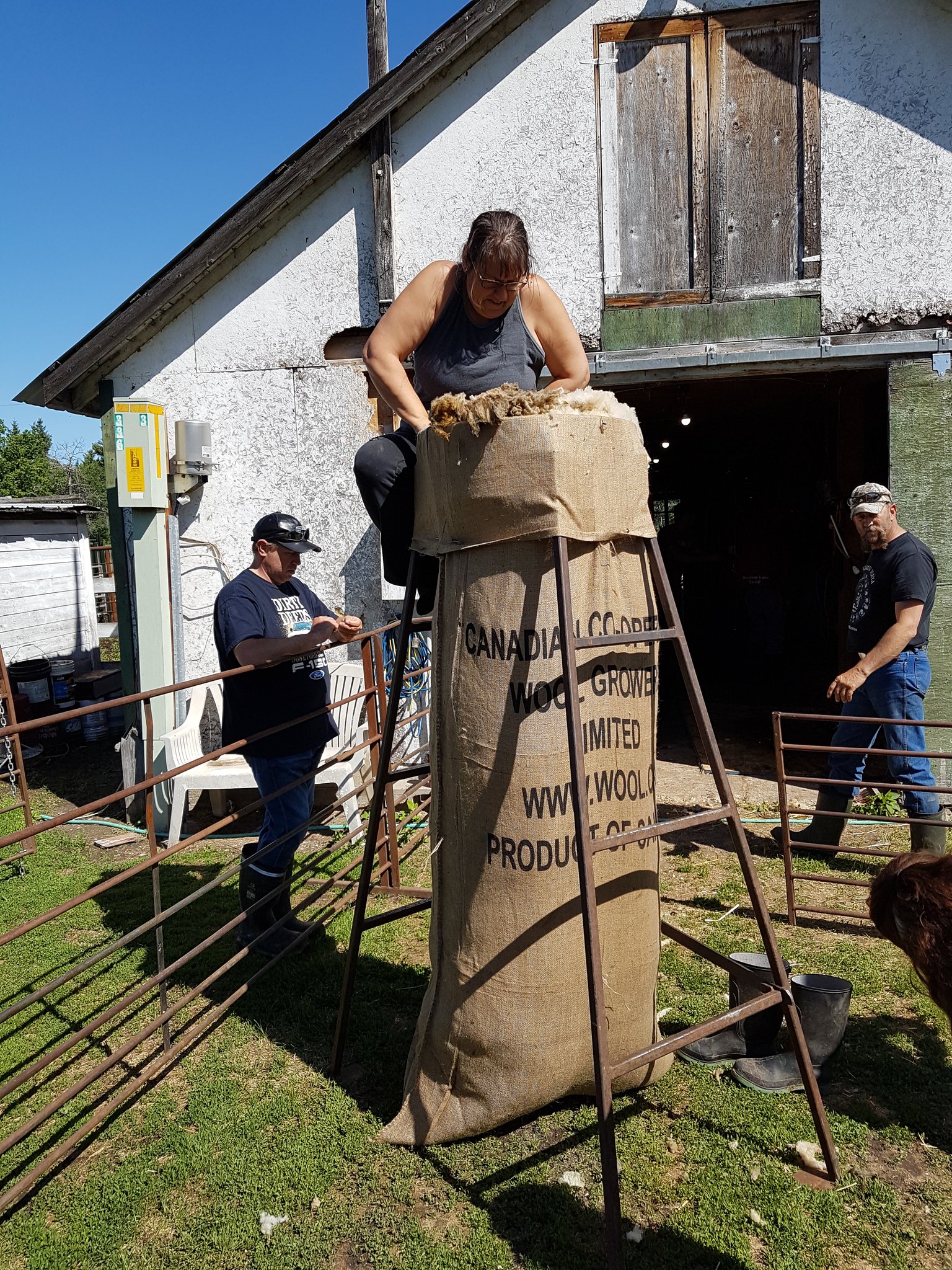 The beginning of June, I took the ewes, Krafty and Shelia, to be professionally shorn at a neighbours. I had no experience with this sort of communal gathering of the shepherds in the area and was surprised at who all owned sheep. My ewes were the only ones who arrived with halters on and could be led to the shearing floor. When the shearer was finish, I was rather horrified at the look of my ewes—they were NAKED!! I did not like the look of them without their wool. I think they looked way too goat-like and I wanted them to continue looking like the cute, square, fluffy boxes on 4 legs with an expressive face. They even seemed to lose their expressive faces when shorn. The shearer was efficient and did not take long to do a sheep. The huge wool bag was also something I had never seen before and “tramping the wool” was a whole new concept too. I’m glad Tanis volunteered to do the tramping!