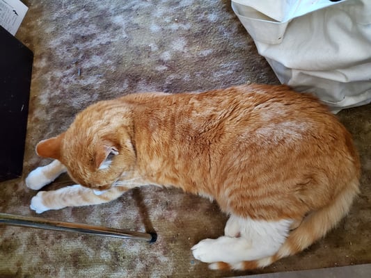 We are used to Gwen being a living scarf, but she has added a new designation to her repertoire. She took to sitting on top of the eggs in their boxes where they are stored in the hallway, we even had to add a cover to protect the boxes from the new "sitting hen (cat)"! Gwen is very out of sorts this fall because the two old cats, Annie and Sumo, got moved into the house. Later Joker appeared to have an abscess in his paw and we had to bring him in and administer medication. So now there are FOUR cats in my house!!