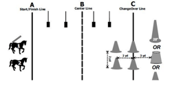 Keyhole: participant rides down the arena, crossing the start/finish line, passing between the two pairs of cones, circles around the barrel, passes back through the 2 pairs of cones and crosses the s/f line. Circle around the barrel may be in either direction. Knocking over a cone causes disqualification.
