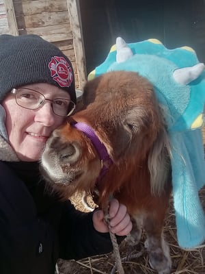 Amanda B LOVES the little ponies and has lots of fun with them. She helped with several of our efforts to improve CC’s leg and takes CC for walks when it’s not inclement. Mr Big is not forgotten, and he and Missy get to go for an occasional driving adventure. Amanda continues to be in the quadragenarian crowd, and we celebrated her birthday with a trail ride and a birthday supper with cup cakes.